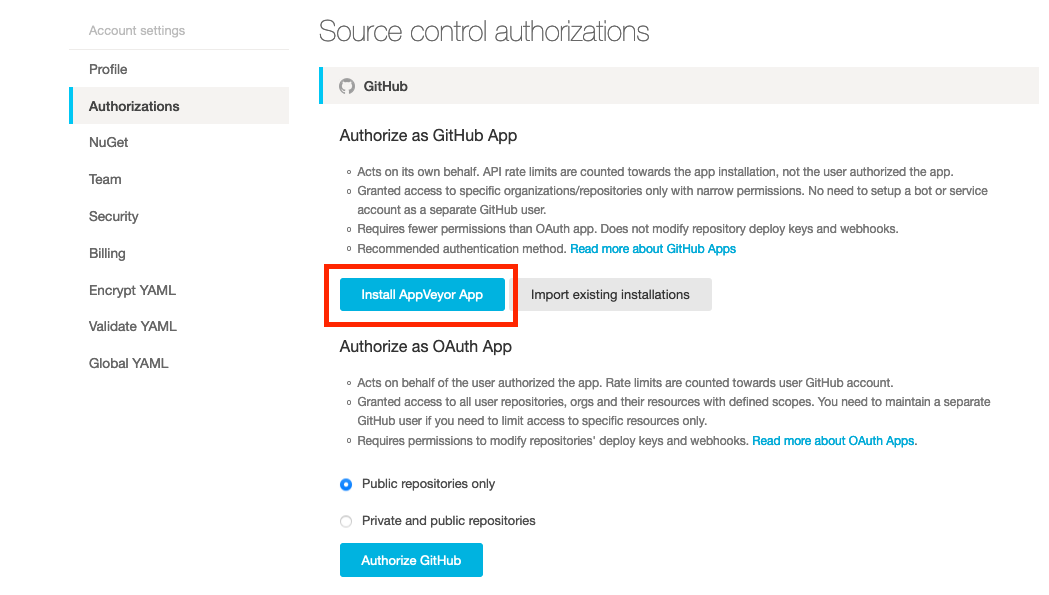 2. Authorize AppVeyor App as GitHub App in the account settings by clicking on the Install AppVeyor App button.