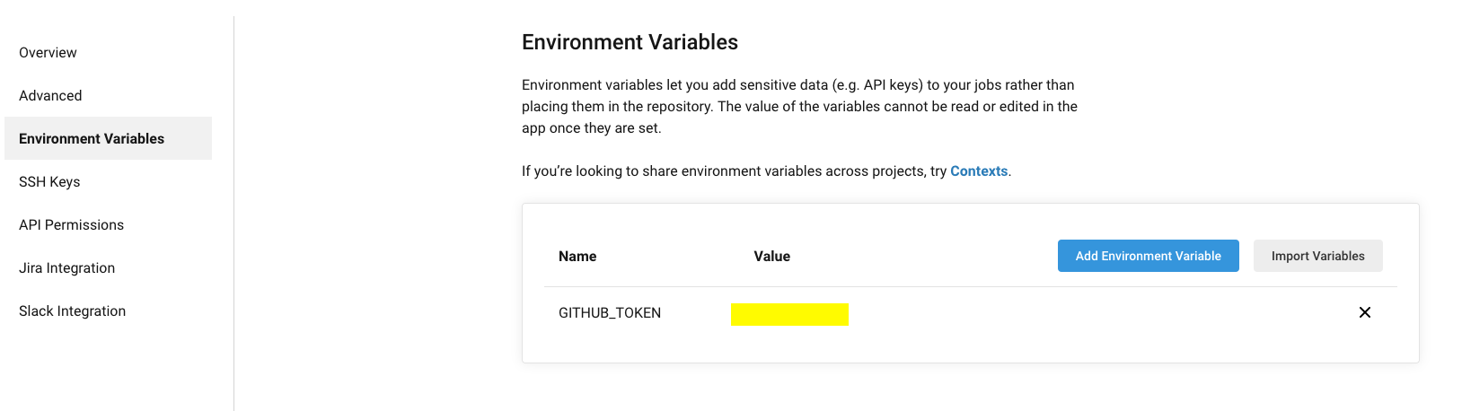 2. On the left, click on the Environment Variables tab and add a custom Environment Variable, GITHUB_TOKEN, which contains the value of your GitHub Personal Access Token.