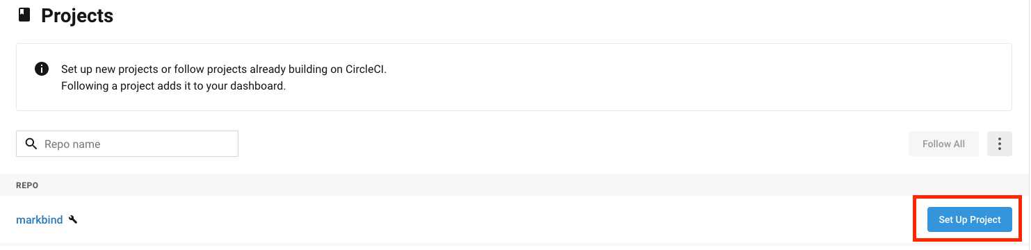 3. In the projects dashboard, click on the Set Up Project button beside the repo containing your MarkBind site.