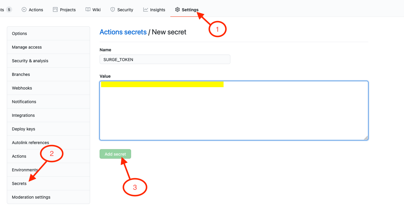 6. In the repo of your MarkBind site, create a new secret by going to "Settings"->"Secrets" and naming it as SURGE_TOKEN and setting its value to the value of the generated surge token.