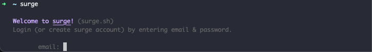 2. Next, type surge in the terminal. You should see the following prompt: